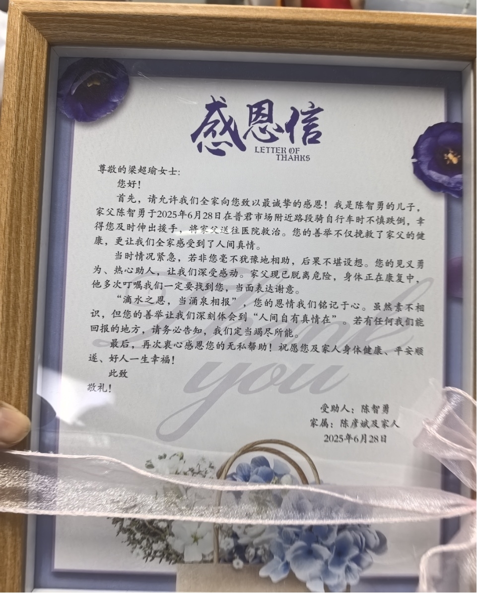 那是一个普通的傍晚,梁超瑜像往常一样结束了一天的工作,在回家的路上。突然,路边一阵异动引起了她的注意—— 一位老人骑车时不慎摔倒,痛苦地躺在地上。此时,过往行人步履匆匆,有人犹豫,有人观望,而梁超瑜没有丝毫迟疑,她立刻快步上前。