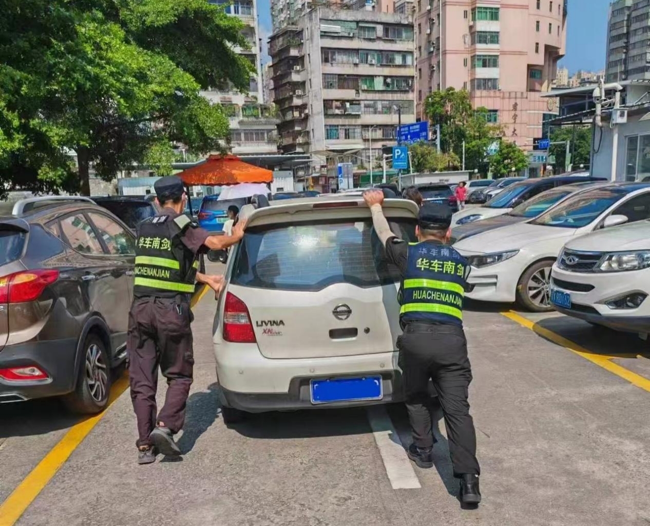 面对这一棘手情况,余尚衍和骆文华没有丝毫犹豫,也未被高温的“烤”验所击退。他们心中只有一个念头:尽快恢复停车场的交通秩序,保障医院的正常运转。只见他们迅速跑到故障车辆后方,双手稳稳地扶住车身,齐声喊着口号,齐心协力地推动车辆。