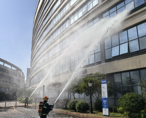 因模拟“火势”有扩大趋势,现场指挥决定升级救援,消防监控中心立即拨打“119”报警。4分钟后,区消防救援大队消防车抵达。医院现场指挥第一时间交接起火点、燃烧物、人员疏散等关键信息,消防队员迅速部署,消防车水炮与楼内消火栓同步发力,水龙精准“直击”火魔,几分钟内便彻底扑灭“大火”,浓烟渐散。